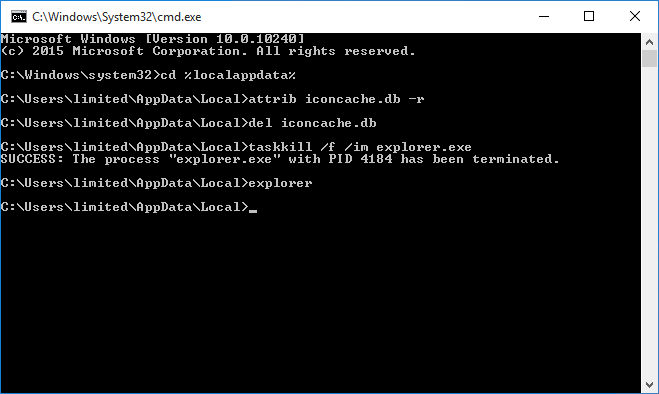 Remove the hidden attribute from the icon cache database by typing the following and pressing enter: